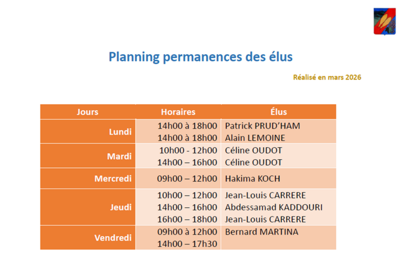 Voici les horaires des permanences des Élus en mairie.